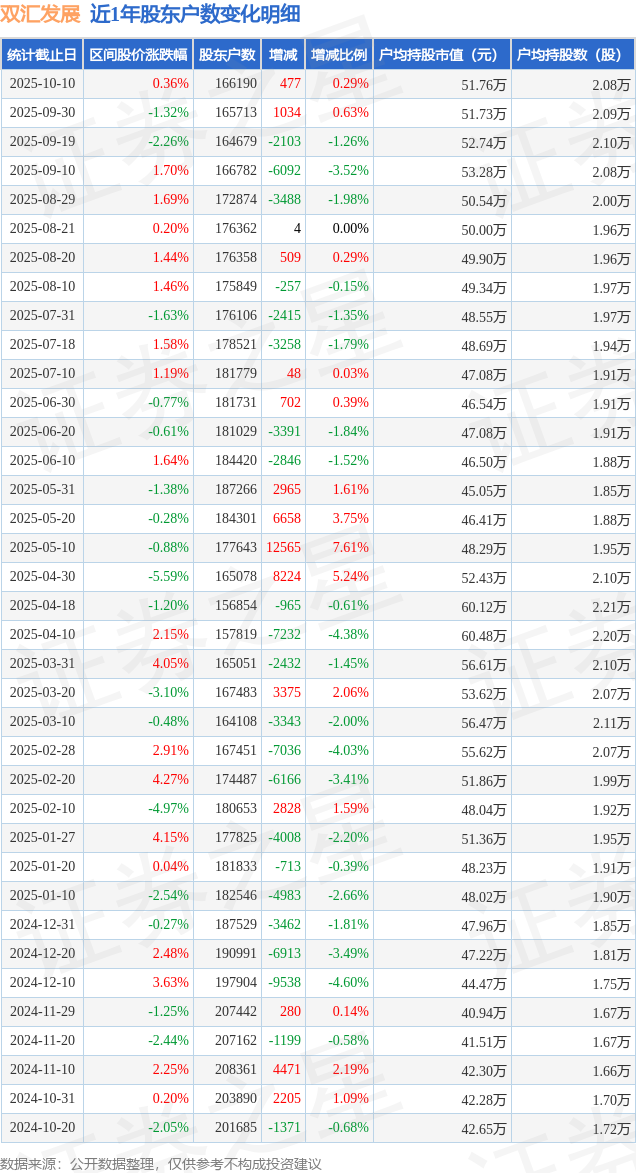 从股价来看,2025年9月30日至2025年10月10日,双汇发展区间涨幅为0.36%,在此期间股东户数增加477.0户,增幅为0.29%。
