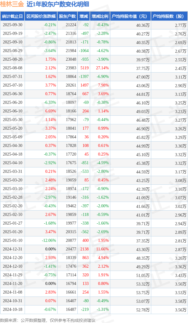 从股价来看,2025年9月19日至2025年9月30日,桂林三金区间跌幅为0.21%,在此期间股东户数减少92.0户,减幅为0.43%。