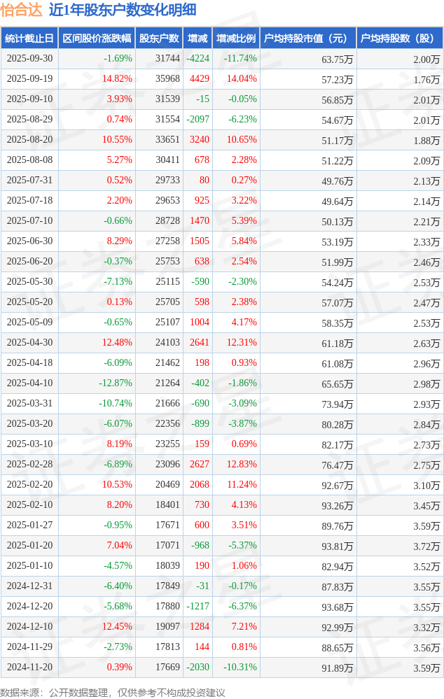 从股价来看,2025年9月19日至2025年9月30日,怡合达区间跌幅为1.69%,在此期间股东户数减少4224.0户,减幅为11.74%。