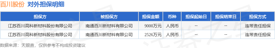 百川股份10月10日披露2笔对外担保,被担保方为南通百川新材料有限公司。对外担保明细如下表: