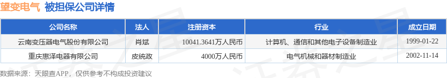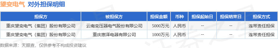望变电气10月10日披露2笔对外担保,被担保公司2家。对外担保明细如下表: