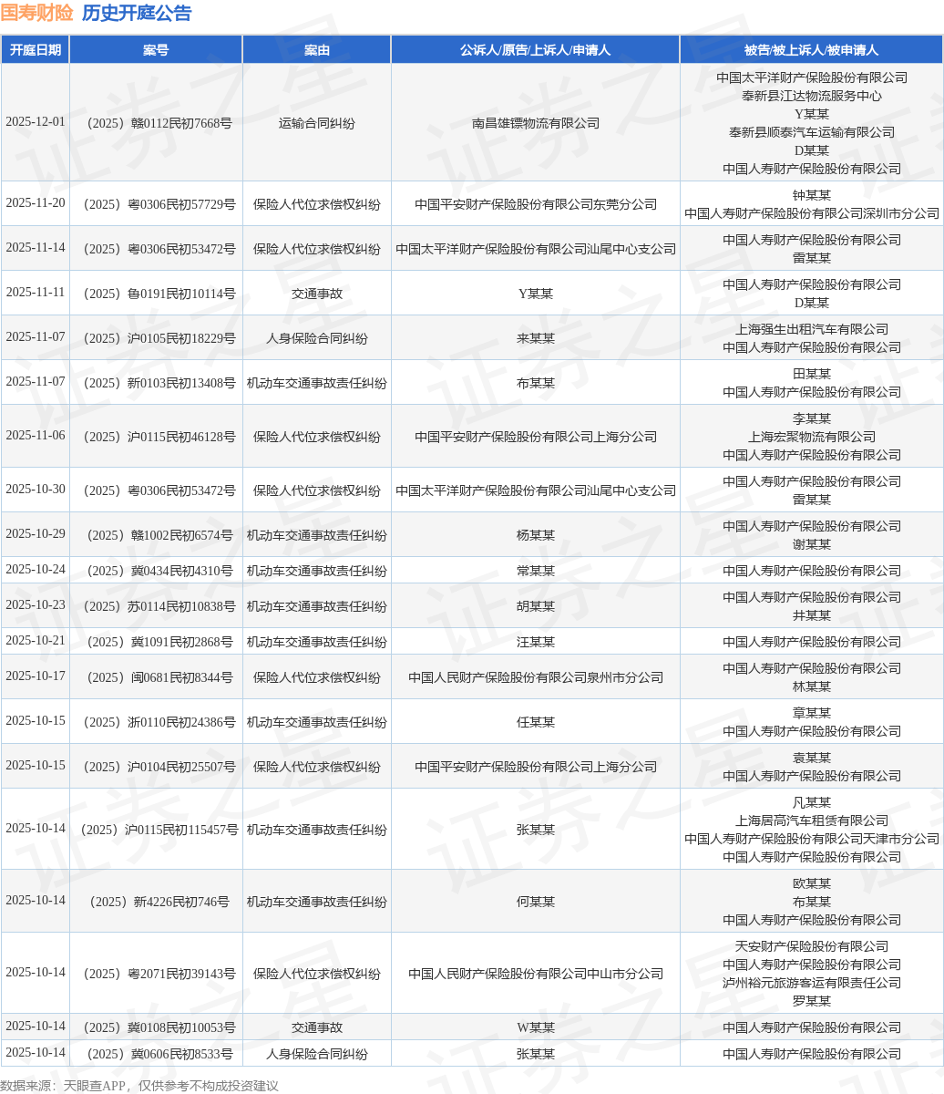 案号:(2025)冀0108民初10053号根据统计,近一年内以中国人寿财产保险股份有限公司为当事人的历史开庭公告有485则,其中案由为“机动车交通事故责任纠纷”的公告以313则居首,其次为“保险人代位求偿权纠纷”有46则,“保险纠纷”有16则。历史开庭公告(前20条)如下: