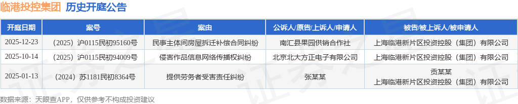 案号:(2025)沪0115民初94009号根据统计,近一年内以上海临港新片区投资控股(集团)有限公司为当事人的历史开庭公告有3则,其中案由为“侵害作品信息网络传播权纠纷”的公告以1则居首,其次为“提供劳务者受害责任纠纷”有1则,“民事主体间房屋拆迁补偿合同纠纷”有1则。历史开庭公告如下: