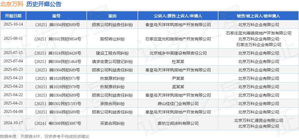 案号:(2025)冀0304民初689号根据统计,近一年内以北京万科企业有限公司为当事人的历史开庭公告有11则,其中案由为“损害公司利益责任纠纷”的公告以4则居首,其次为“恢复原状纠纷”有2则,“买卖合同纠纷”有1则。历史开庭公告如下: