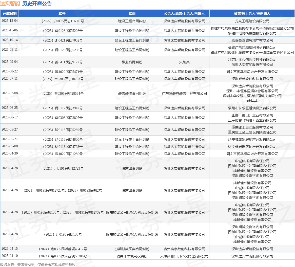 案号:(2025)浙0421民初7052号根据统计,近一年内以深圳达实智能股份有限公司为当事人的历史开庭公告有48则,其中案由为“建设工程施工合同纠纷”的公告以26则居首,其次为“买卖合同纠纷”有3则,“委托合同纠纷”有3则。历史开庭公告(前20条)如下: