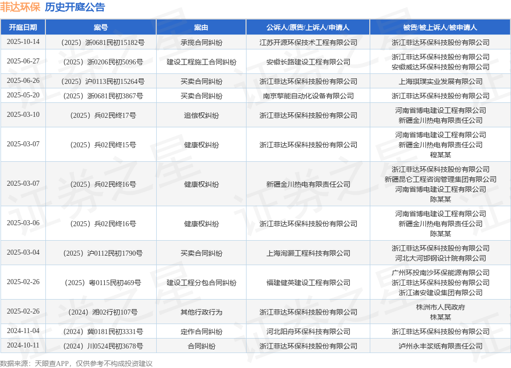 案号:(2025)浙0681民初15182号根据统计,近一年内以浙江菲达环保科技股份有限公司为当事人的历史开庭公告有13则,其中案由为“买卖合同纠纷”的公告以3则居首,其次为“健康权纠纷”有3则,“其他行政行为”有1则。历史开庭公告如下: