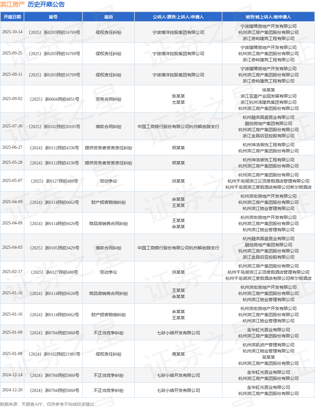 案号:(2025)浙0203民初16769号根据统计,近一年内以杭州滨江房产集团股份有限公司为当事人的历史开庭公告有18则,其中案由为“侵权责任纠纷”的公告以4则居首,其次为“不正当竞争纠纷”有3则,“借款合同纠纷”有2则。历史开庭公告如下: