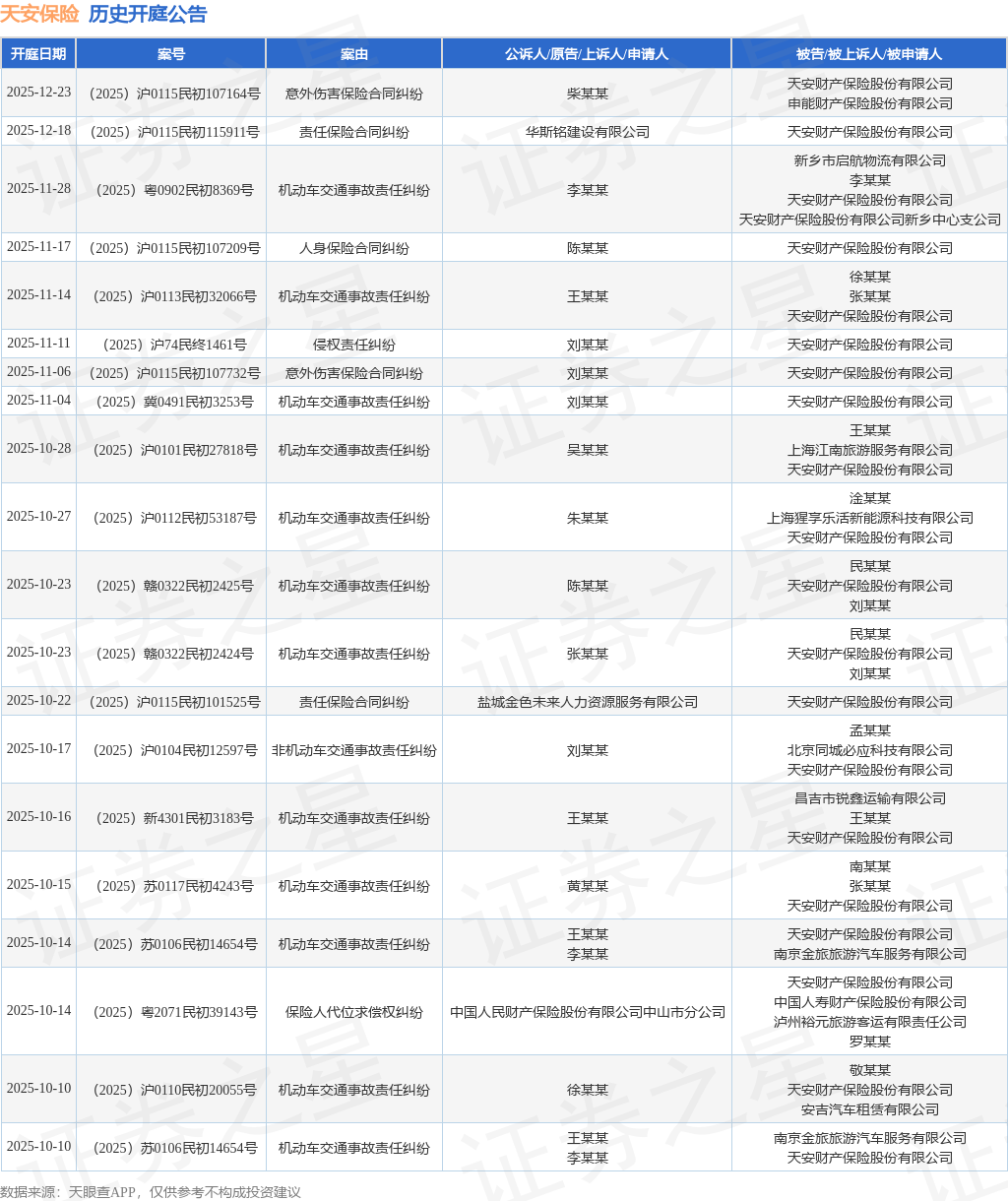 案号:(2025)粤2071民初39143号根据统计,近一年内以天安财产保险股份有限公司为当事人的历史开庭公告有513则,其中案由为“机动车交通事故责任纠纷”的公告以271则居首,其次为“财产保险合同纠纷”有57则,“人身保险合同纠纷”有28则。历史开庭公告(前20条)如下: