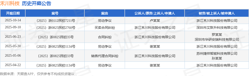 根据统计,近一年内以浙江禾川科技股份有限公司为当事人的历史开庭公告有6则,其中案由为“劳动争议”的公告以3则居首,其次为“买卖合同纠纷”有1则,“合同纠纷”有1则。历史开庭公告如下: