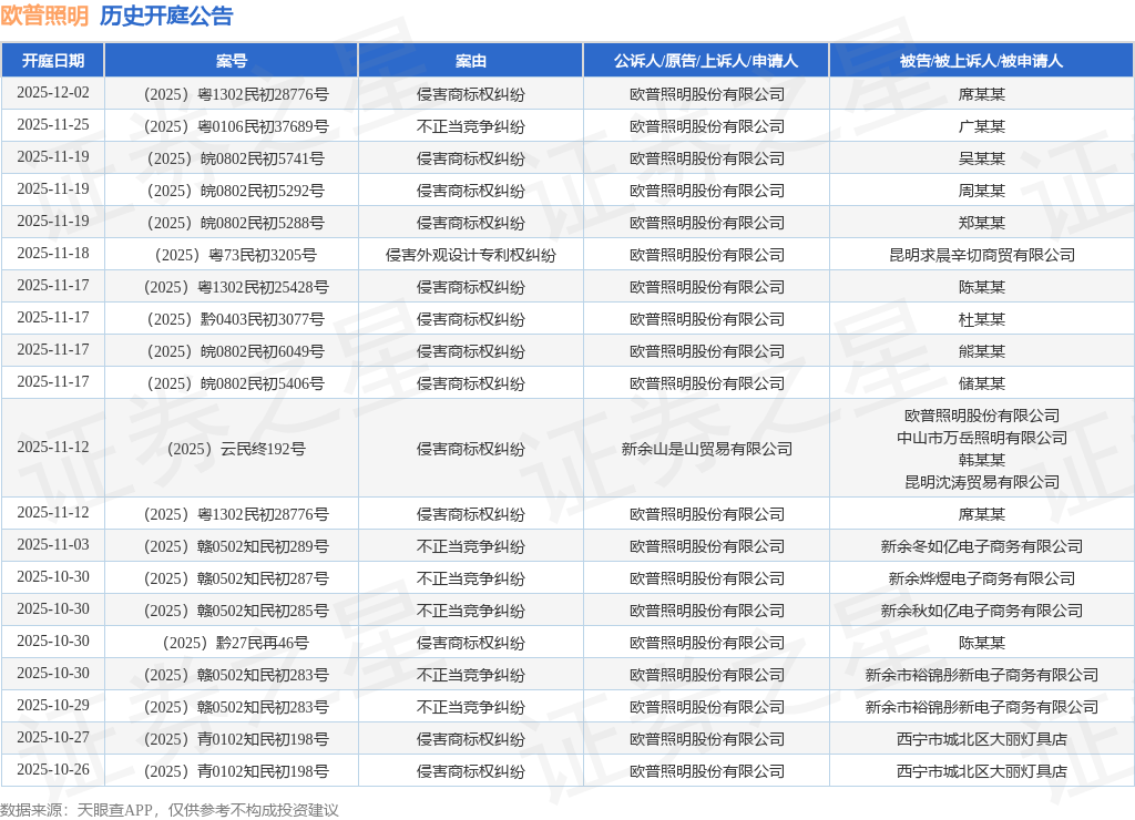 案号:(2025)川1702民初2676号根据统计,近一年内以欧普照明股份有限公司为当事人的历史开庭公告有605则,其中案由为“侵害商标权纠纷”的公告以508则居首,其次为“商标权权属、侵权纠纷”有26则,“侵害商标权”有25则。历史开庭公告(前20条)如下: