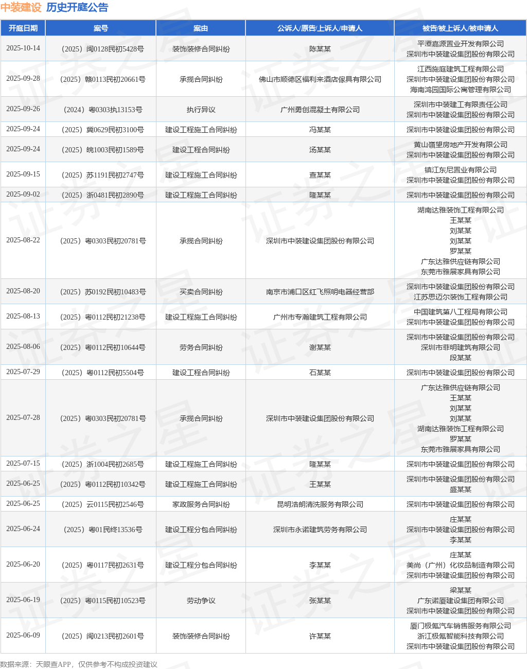 案号:(2025)闽0128民初5428号根据统计,近一年内以深圳市中装建设集团股份有限公司为当事人的历史开庭公告有104则,其中案由为“建设工程施工合同纠纷”的公告以21则居首,其次为“劳务合同纠纷”有19则,“建设工程合同纠纷”有16则。历史开庭公告(前20条)如下: