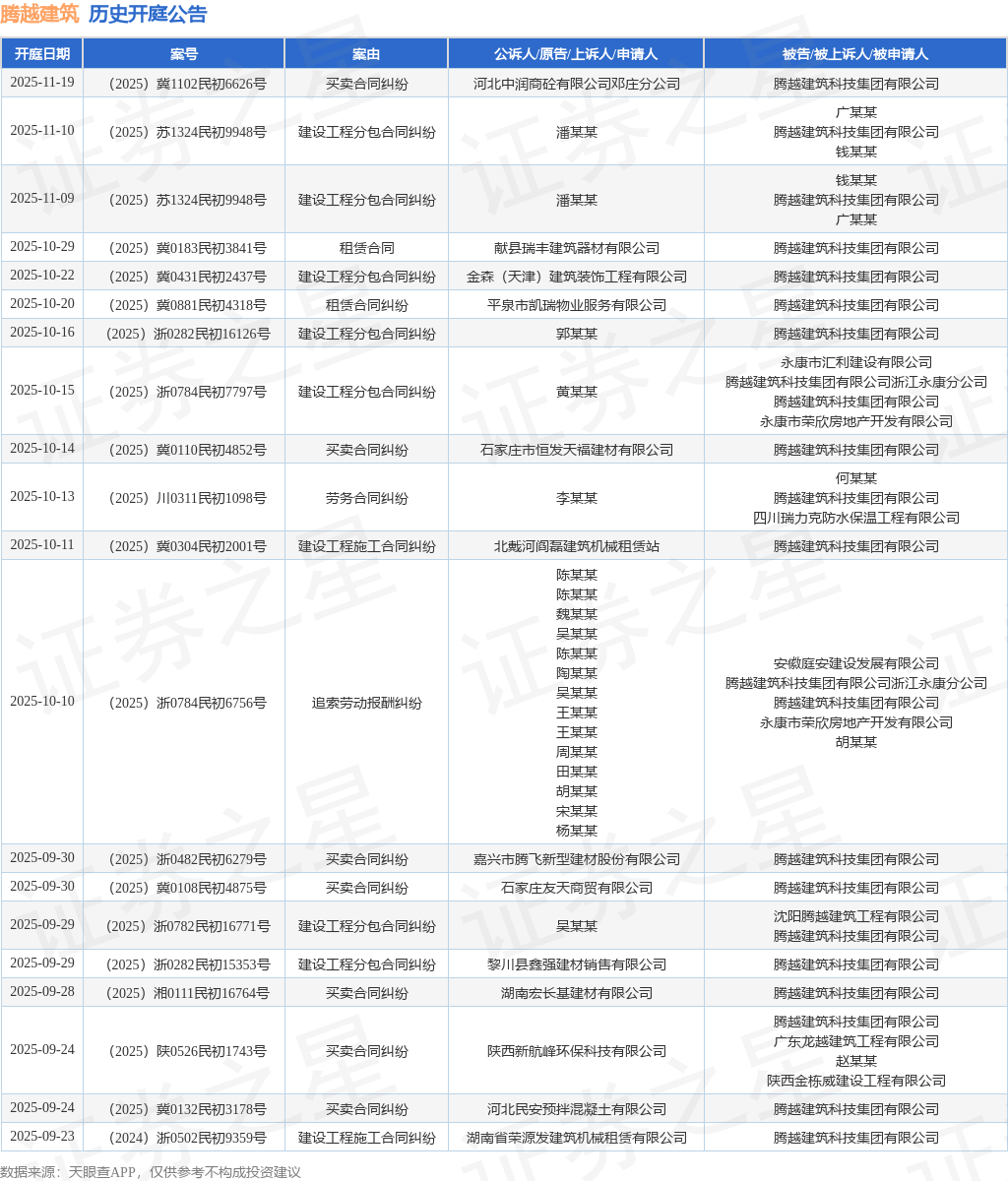 案号:(2025)冀0110民初4852号根据统计,近一年内以腾越建筑科技集团有限公司为当事人的历史开庭公告有430则,其中案由为“买卖合同纠纷”的公告以87则居首,其次为“建设工程施工合同纠纷”有79则,“劳务合同纠纷”有59则。历史开庭公告(前20条)如下: