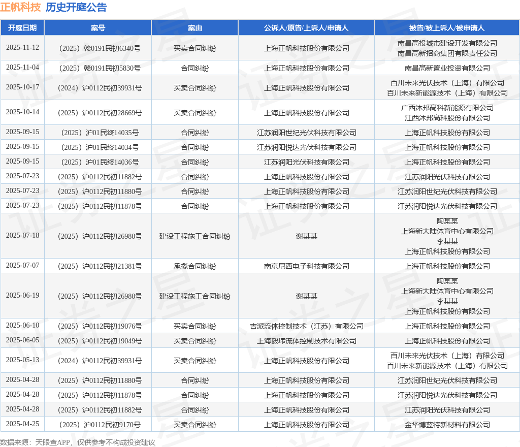 案号:(2025)沪0112民初28669号根据统计,近一年内以上海正帆科技股份有限公司为当事人的历史开庭公告有42则,其中案由为“买卖合同纠纷”的公告以16则居首,其次为“合同纠纷”有10则,“承揽合同纠纷”有9则。历史开庭公告(前20条)如下: