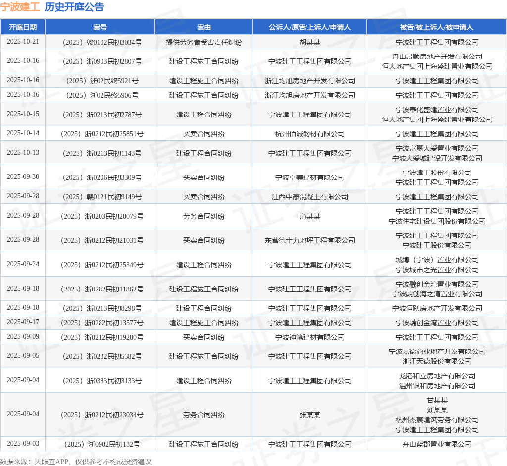 案号:(2025)浙0212民初25851号根据统计,近一年内以宁波建工工程集团有限公司为当事人的历史开庭公告有125则,其中案由为“买卖合同纠纷”的公告以35则居首,其次为“建设工程施工合同纠纷”有25则,“建设工程合同纠纷”有20则。历史开庭公告(前20条)如下: