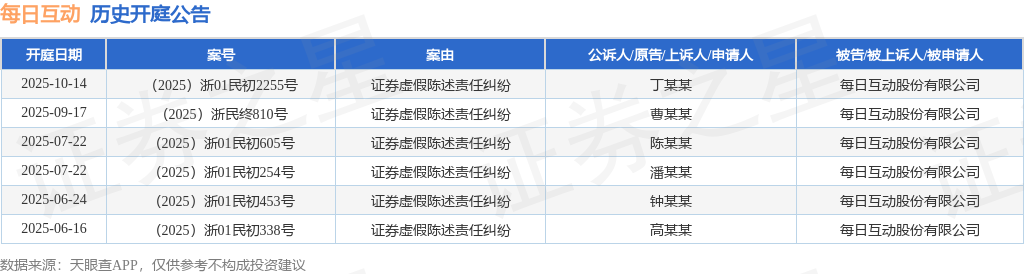 根据统计,近一年内以每日互动股份有限公司为当事人的历史开庭公告有6则,其中案由为“证券虚假陈述责任纠纷”的公告以6则居首。历史开庭公告如下: