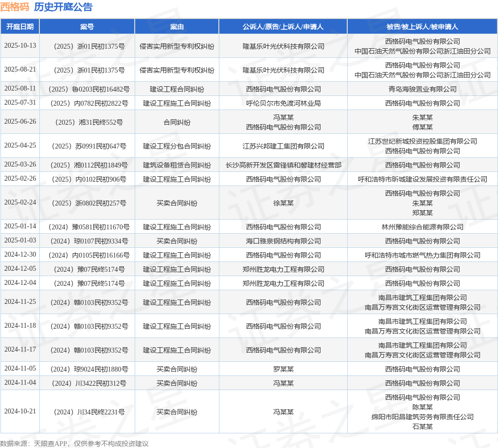 案号:(2025)浙01民初1375号根据统计,近一年内以西格码电气股份有限公司为当事人的历史开庭公告有20则,其中案由为“建设工程施工合同纠纷”的公告以9则居首,其次为“买卖合同纠纷”有5则,“侵害实用新型专利权纠纷”有2则。历史开庭公告如下: