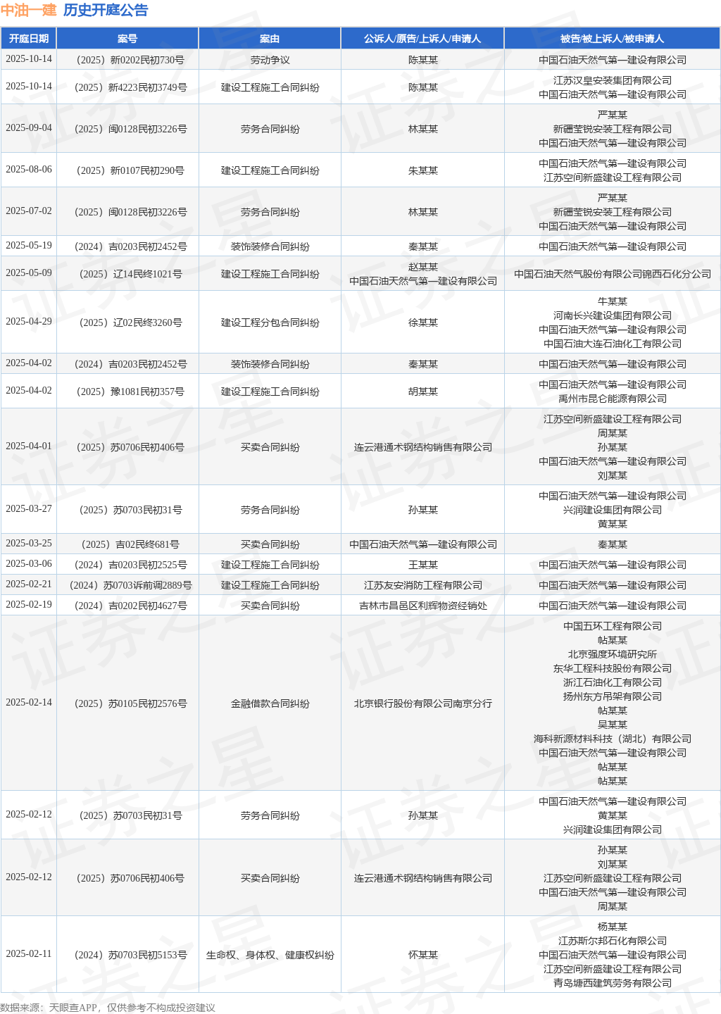 案号:(2025)新0202民初730号根据统计,近一年内以中国石油天然气第一建设有限公司为当事人的历史开庭公告有44则,其中案由为“建设工程施工合同纠纷”的公告以11则居首,其次为“买卖合同纠纷”有9则,“劳务合同纠纷”有6则。历史开庭公告(前20条)如下: