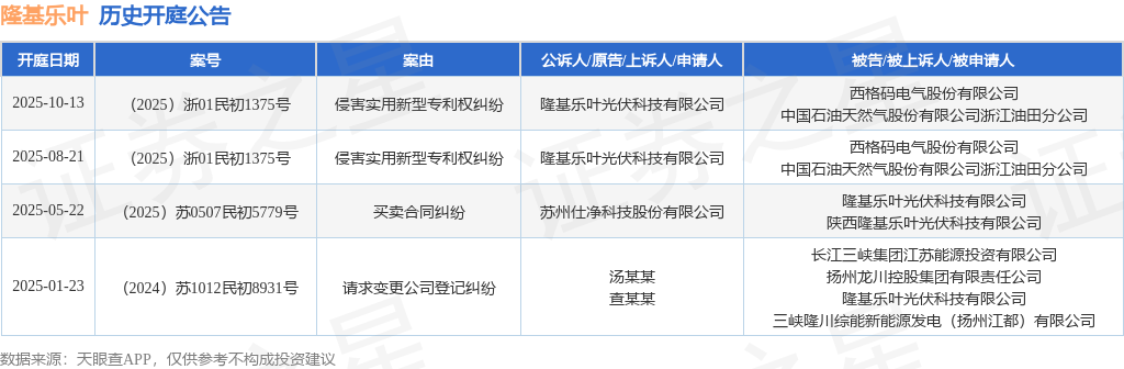 案号:(2025)浙01民初1375号根据统计,近一年内以隆基乐叶光伏科技有限公司为当事人的历史开庭公告有4则,其中案由为“侵害实用新型专利权纠纷”的公告以2则居首,其次为“买卖合同纠纷”有1则,“请求变更公司登记纠纷”有1则。历史开庭公告如下: