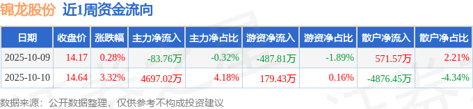 资金流向数据方面,本周锦龙股份主力资金合计净流入4613.26万元,游资资金合计净流出308.38万元,散户资金合计净流出4304.88万元。本周资金流向一览见下表: