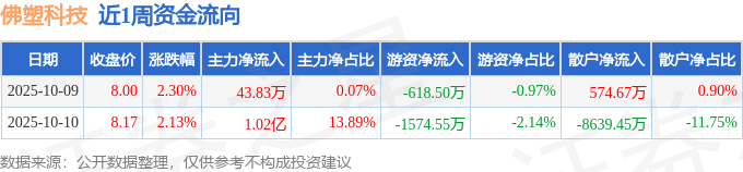 资金流向数据方面,本周佛塑科技主力资金合计净流入1.03亿元,游资资金合计净流出2193.05万元,散户资金合计净流出8064.78万元。本周资金流向一览见下表: