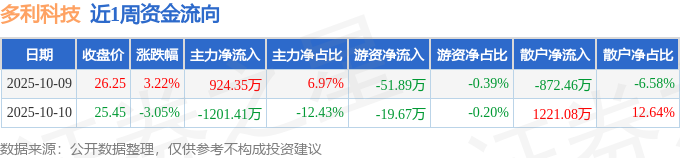 资金流向数据方面,本周多利科技主力资金合计净流出277.06万元,游资资金合计净流出71.56万元,散户资金合计净流入348.62万元。本周资金流向一览见下表: