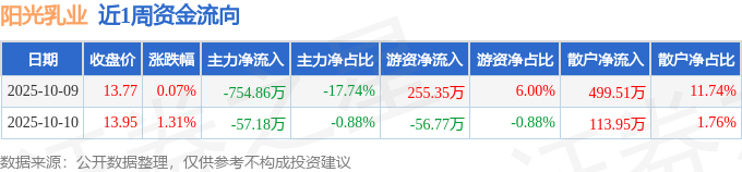 资金流向数据方面,本周阳光乳业主力资金合计净流出812.04万元,游资资金合计净流入198.58万元,散户资金合计净流入613.46万元。本周资金流向一览见下表: