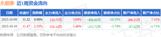 资金流向数据方面,本周永顺泰主力资金合计净流入429.89万元,游资资金合计净流出620.71万元,散户资金合计净流入190.82万元。本周资金流向一览见下表: