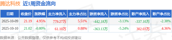 资金流向数据方面,本周腾达科技主力资金合计净流入840.37万元,游资资金合计净流出805.31万元,散户资金合计净流出35.07万元。本周资金流向一览见下表: