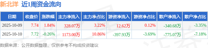 资金流向数据方面,本周新北洋主力资金合计净流入1501.07万元,游资资金合计净流出385.32万元,散户资金合计净流出1115.75万元。本周资金流向一览见下表: