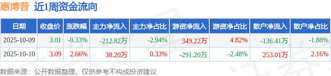 资金流向数据方面,本周惠博普主力资金合计净流出174.62万元,游资资金合计净流入58.02万元,散户资金合计净流入116.6万元。本周资金流向一览见下表: