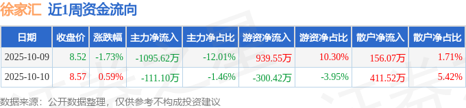 资金流向数据方面,本周徐家汇主力资金合计净流出1206.73万元,游资资金合计净流入639.14万元,散户资金合计净流入567.59万元。本周资金流向一览见下表: