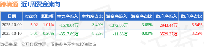 资金流向数据方面,本周跨境通主力资金合计净流出5088.53万元,游资资金合计净流出1384.18万元,散户资金合计净流入6472.71万元。本周资金流向一览见下表: