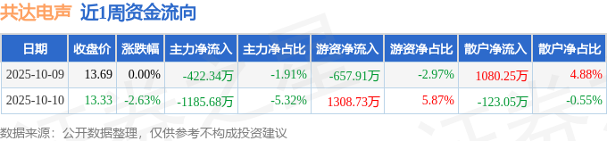 资金流向数据方面,本周共达电声主力资金合计净流出1608.02万元,游资资金合计净流入650.82万元,散户资金合计净流入957.2万元。本周资金流向一览见下表:
