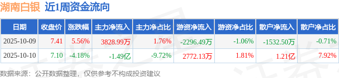 沪深股通持股方面,截止2025年10月10日收盘,湖南白银深股通持股数为522.49万股,占流通股比为24.0%。