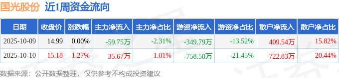 资金流向数据方面,本周国光股份主力资金合计净流出24.08万元,游资资金合计净流出1108.29万元,散户资金合计净流入1132.37万元。本周资金流向一览见下表: