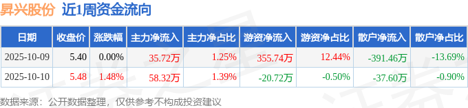 资金流向数据方面,本周昇兴股份主力资金合计净流入94.03万元,游资资金合计净流入335.02万元,散户资金合计净流出429.06万元。本周资金流向一览见下表: