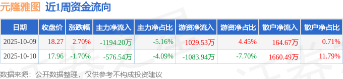 资金流向数据方面,本周元隆雅图主力资金合计净流出1770.75万元,游资资金合计净流出54.41万元,散户资金合计净流入1825.16万元。本周资金流向一览见下表: