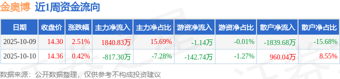 资金流向数据方面,本周金奥博主力资金合计净流入1023.53万元,游资资金合计净流出143.88万元,散户资金合计净流出879.64万元。本周资金流向一览见下表: