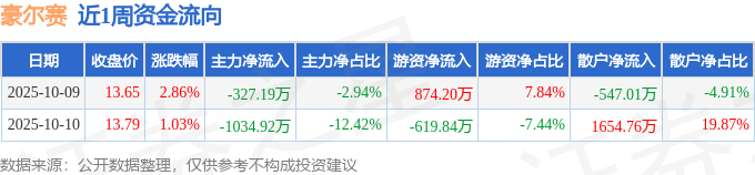 资金流向数据方面,本周豪尔赛主力资金合计净流出1362.11万元,游资资金合计净流入254.36万元,散户资金合计净流入1107.75万元。本周资金流向一览见下表: