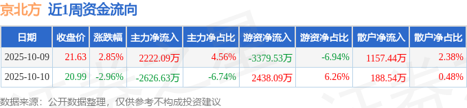 资金流向数据方面,本周京北方主力资金合计净流出404.54万元,游资资金合计净流出941.44万元,散户资金合计净流入1345.98万元。本周资金流向一览见下表: