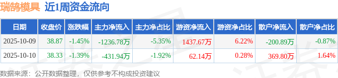 资金流向数据方面,本周瑞鹄模具主力资金合计净流出1668.72万元,游资资金合计净流入1499.8万元,散户资金合计净流入168.91万元。本周资金流向一览见下表: