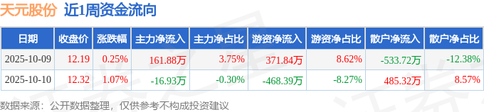 资金流向数据方面,本周天元股份主力资金合计净流入144.95万元,游资资金合计净流出96.55万元,散户资金合计净流出48.4万元。本周资金流向一览见下表: