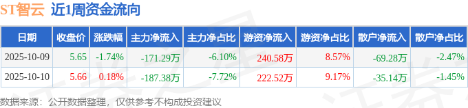 资金流向数据方面,本周ST智云主力资金合计净流出358.67万元,游资资金合计净流入463.1万元,散户资金合计净流出104.43万元。本周资金流向一览见下表: