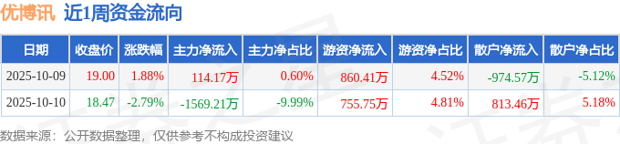 资金流向数据方面,本周优博讯主力资金合计净流出1455.05万元,游资资金合计净流入1616.16万元,散户资金合计净流出161.11万元。本周资金流向一览见下表: