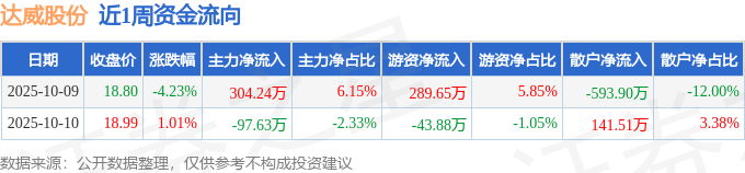 资金流向数据方面,本周达威股份主力资金合计净流入206.61万元,游资资金合计净流入245.77万元,散户资金合计净流出452.39万元。本周资金流向一览见下表: