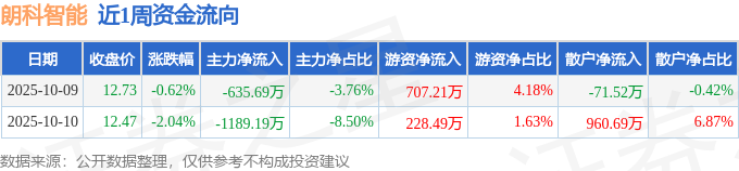资金流向数据方面,本周朗科智能主力资金合计净流出1824.87万元,游资资金合计净流入935.7万元,散户资金合计净流入889.17万元。本周资金流向一览见下表: