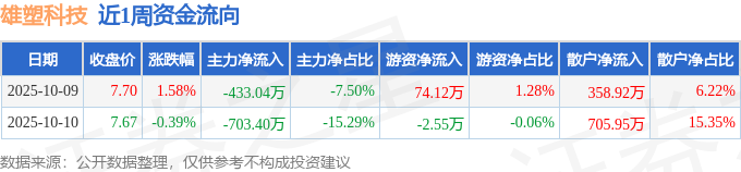 资金流向数据方面,本周雄塑科技主力资金合计净流出1136.44万元,游资资金合计净流入71.57万元,散户资金合计净流入1064.87万元。本周资金流向一览见下表:
