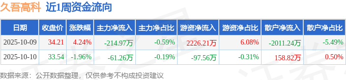 资金流向数据方面,本周久吾高科主力资金合计净流出276.23万元,游资资金合计净流入2128.64万元,散户资金合计净流出1852.42万元。本周资金流向一览见下表: