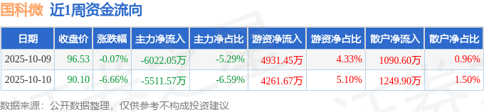 资金流向数据方面,本周国科微主力资金合计净流出1.15亿元,游资资金合计净流入9193.12万元,散户资金合计净流入2340.5万元。本周资金流向一览见下表: