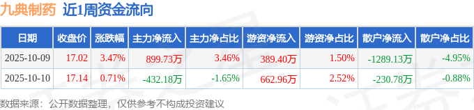 资金流向数据方面,本周九典制药主力资金合计净流入467.55万元,游资资金合计净流入1052.36万元,散户资金合计净流出1519.91万元。本周资金流向一览见下表: